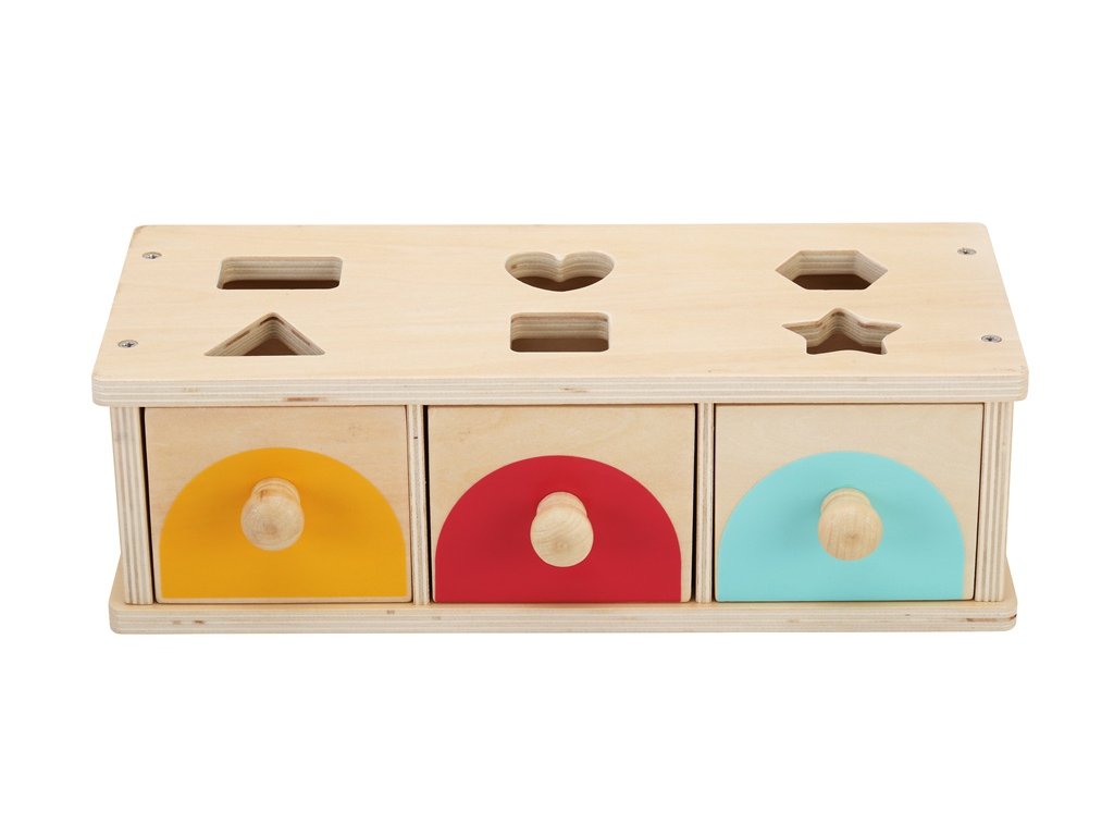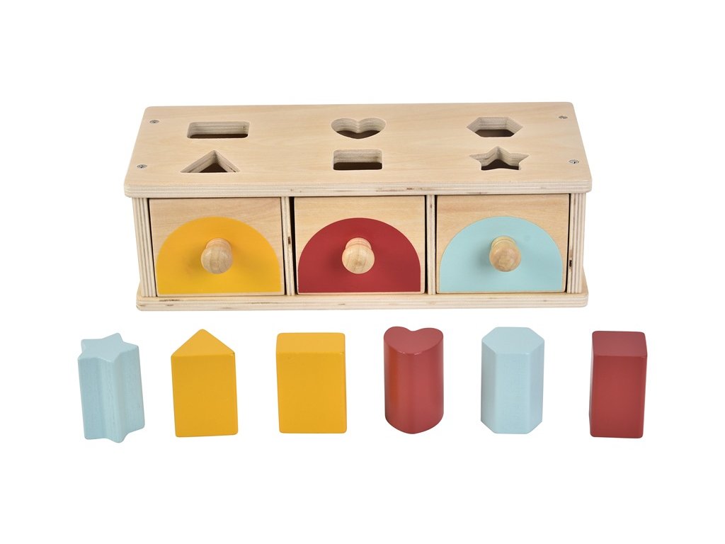 Chytrá dřevěná hračka, která spojuje zábavu s učením! Děti vhazují tvary do otvorů podle jejich barvy a tvaru. Každý ze tří šuplíků má nad sebou dva otvory a je zepředu barevně označen. Podaří-li se vhazovaný tvar správně roztřídit, sklouzne do odpovídajícího šuplíku. Dítě tak okamžitě vidí výsledek svého pokusu, což rozvíjí pochopení principu příčina–následek.Hračka podporuje logické myšlení, koordinaci ruka-oko a smyslové vnímání. Díky jednoduchému, ale promyšlenému designu se řadí mezi Montessori inspirované pomůcky. Děti se učí samostatně třídit, vnímat barvy, tvary i prostor. Kombinace přírodního dřeva s jasnými barvami spolu s jednoduchým a kvalitním provedením dělají z této hračky pěkný doplněk každého pokojíčku nebo herny. Hlavní vlastnosti: 3 barevně odlišené šuplíky, 6 různých barevných tvarůinspirováno Montessorirozvíjí logické myšlení a jemnou motorikunapomáhá k pochopení příčiny a následku třídění podle barvy a tvarukvalitní dřevěné provedenívhodné pro děti od 1 rokuDoplňkové parametry