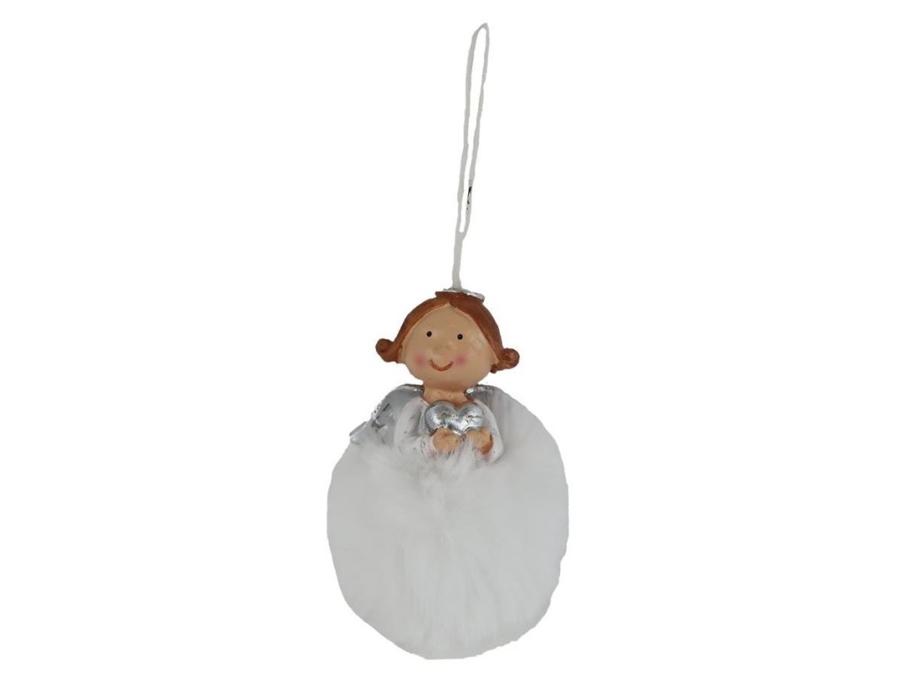 Dekorační anděl k zavěšení. Rozměry: 7,3 x 7,3 x 10 cm. Materiál: polyresin, textil. Barva: stříbrná, bílá. Tento výrobek není hračka. Určeno do vnitřních prostor.Doplňkové parametry