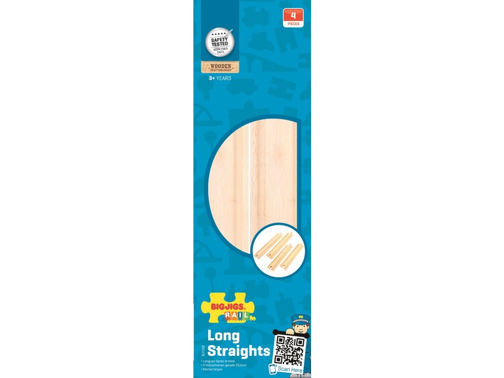 Toto balení obsahuje 4 dlouhé rovné koleje z BigJigs železničního sortimentu. Jsou vyrobeny z kvalitního tvrdého dřeva, jsou také kompatibilní s dalšími dřevěnými vláčkodráhami a tím se stanou skvělým přírustkem do vaší sbírky dřevěných železnic. Hlavní vlastnosti: vláčkodráhy a jejich příslušenství značky Bigjigs Rail je možno kombinovat se všemi dalšími dřevěnými vláčkodráhami na trhuvyrobeno z kvalitních a zodpovědně získaných přírodních materiálůodpovídá současným evropským bezpečnostním normámpodporuje představivost, obratnost a koordinaciDoplňkové parametry