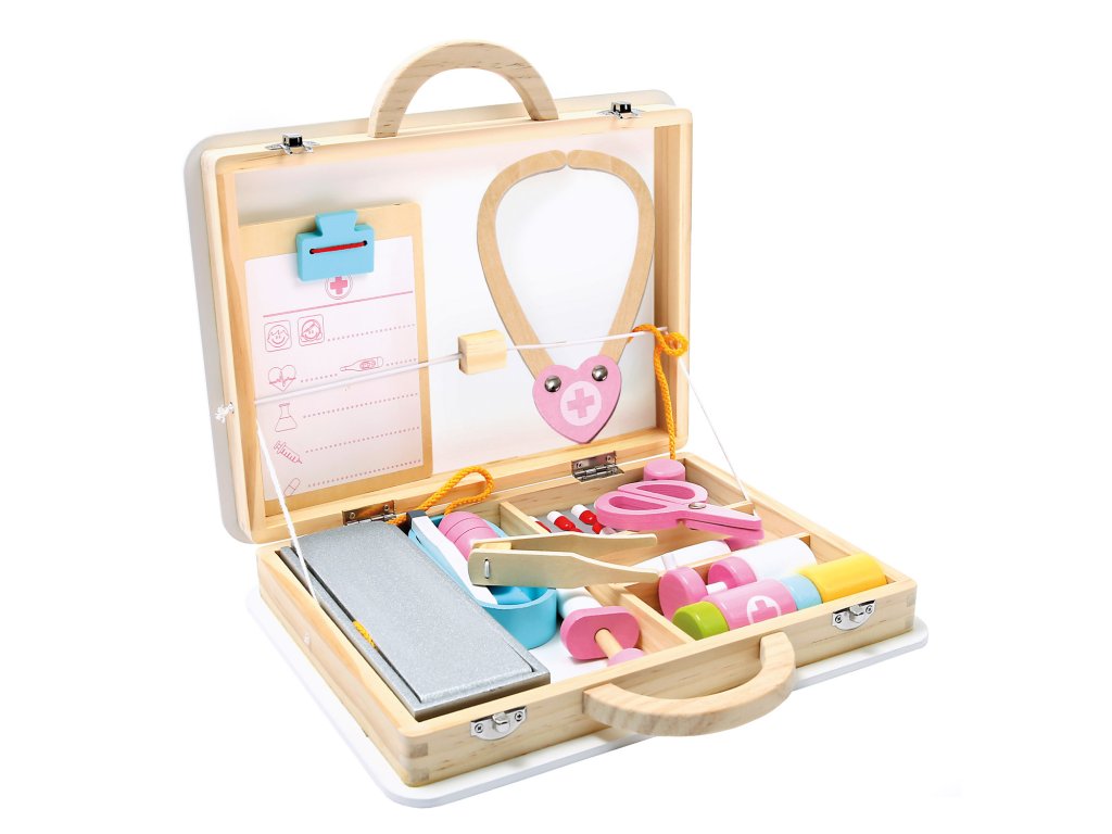 Dřevěný lékařský kufřík pro malé lékaře. Ideální pro hraní, u kterých si děti skutečně dlouho vyhrají. Mohou tak prozkoumávat svět dospělých a užít si u toho spoustu zábavy. Děti kufr samy snadno otevřou, vyjmou z něj potřebné lékařské náčiní a po skončení hraní jej zase znovu složí. Rozsáhlé 16-ti dílné příslušenství je dobře zajištěno širokými gumovými poutky. Hravou formou tak trénují jazykové dovednosti, jemnou motoriku a podporují svou představivost. Dětská zábava tak napomáhá zmenšit strach a obavy z návštěvy lékaře. Upozornění: Použití dětmi do 3 let pouze pod dohledem dospělé osoby. Hlavní vlastnosti: rozsáhlé 16-ti dílné příslušenstvíděti při hře trénují jemnou motoriku, podporují představivostnapomáhá zmenšit strach a obavy z návštěvy lékařevhodné pro děti od 3 letDoplňkové parametry