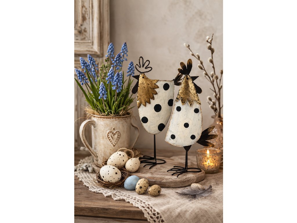 Kovový kohoutek je originální dekorace, která oživí váš domov během jara i velikonočních svátků. Díky jednoduchému designu a kombinaci kovu s jemnou patinou působí dekorace elegantně a zároveň rustikálně. Skvěle se hodí do interiérů ve stylu venkovském, vintage, provence nebo farmhouse.