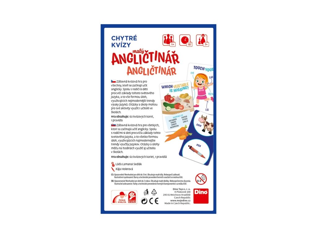 Zábavná kvízová hra pro všechny, kteří se začínají učit anglicky. Spolu s rodiči si děti procvičí základy tohoto světového jazyka, a to vše formou úloh využívajících nejmodernější trendy výuky jazyků. Otázky a úkoly mohou také využít učitelé na základních školách. Obsah balení: 60 kvízových karetpravidla Hlavní vlastnosti: pro všechny, kdo začínají s angličtinouvhodné k procvičování doma i ve školevyrobeno v ČRDoplňkové parametry