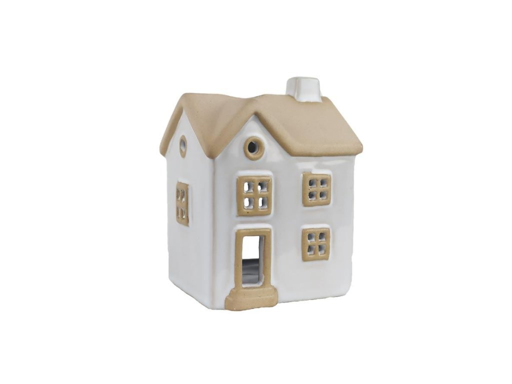 Dekorační domek na svíčku. Rozměry: 8,5 x 7,7 x 11,1 cm. Materiál: keramika. Barva: bílá, hnědá. Drobné povrchové nedokonalosti nejsou vadou výrobku. Nenechávejte zapálené bez dozoru.Doplňkové parametry