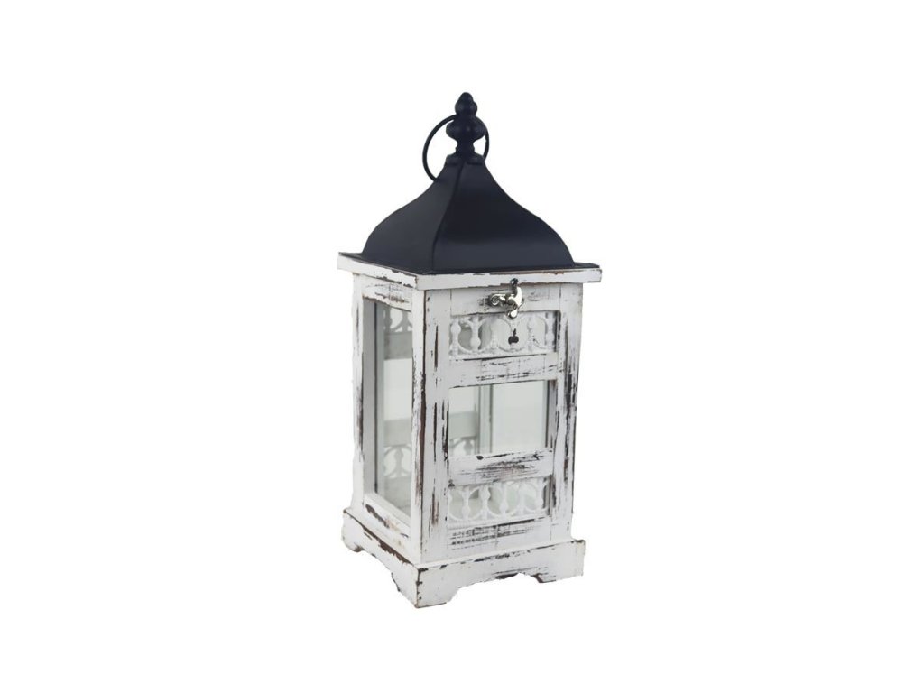 Dřevěná lucerna malá. Vneste do svého domova či zahrady kouzlo orientální stylu. Tato lucerna je vyrobena ze dřeva a skleněných panelů, horní část je z kovu. Lucerna má praktickou rukojeť, která vám usnadní její přenášení mezi domem a zahradou. Rozměry: 14,5 x 14,5 x 36 cm. Materiál: dřevo, kov. Barva: bílá, černá. Upozornění: Nenechávejte zapálené svíčky bez dozoru.Doplňkové parametry
