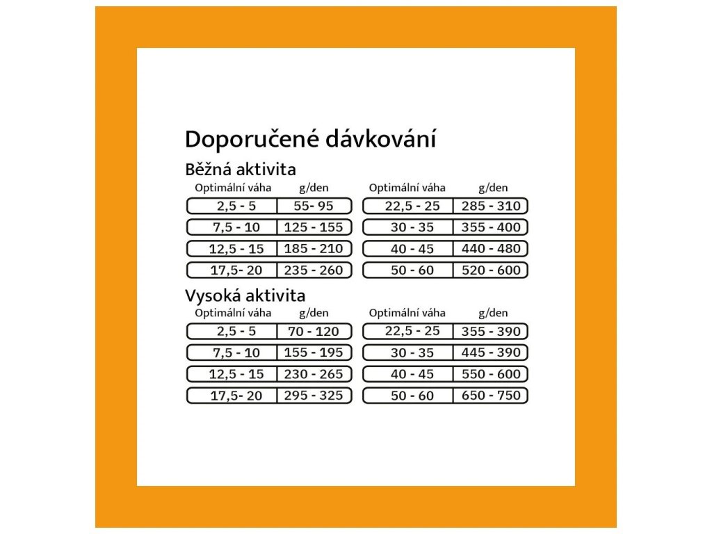 Zajistěte psovi přístup k čisté vodě. Doporučená denní dávka krmiva: viz tabulka. Uvedené údaje jsou orientační. Potřeby se liší v závislosti na věku, plemeni, chovu a aktivitě. Proto může být nutné množství krmiva individuálně upravit. Pokud jsou podávány také pamlsky nebo jiné doplňkové produkty, je třeba množství krmiva snížit. Denní množství by mělo být rozděleno do 2-3 porcí.