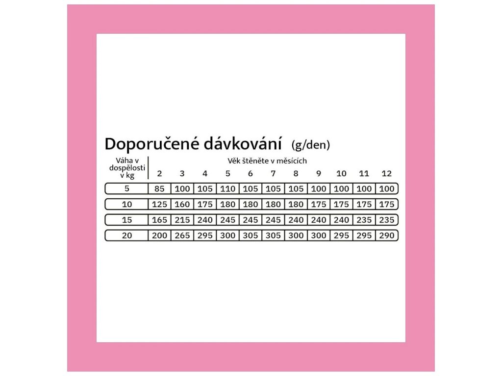 Zajistěte psovi přístup k čisté vodě. Doporučená denní dávka krmiva: viz tabulka. Uvedené údaje jsou orientační. Potřeby se liší v závislosti na věku, plemeni, chovu a aktivitě. Proto může být nutné množství krmiva individuálně upravit. Pokud jsou podávány také pamlsky nebo jiné doplňkové produkty, je třeba množství krmiva snížit. Denní množství by mělo být rozděleno do 2-3 porcí.