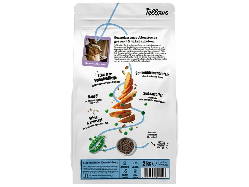 Jedinečná receptura Fellows obsahuje pouze jednu živočišnou bílkovinu, hmyz Hermetia illucens, a jednu rostlinnou bílkovinu v podobě slunečnicových semínek. Pečlivě vybrané suroviny včetně sladkých brambor jako hlavního zdroje sacharidů se v běžných dietách pro psy vyskytují jen zřídka. Přesto tato kombinace napomáhá zvládat příznaky alergie - imunitní systém ji nerozpoznává jako problematickou.