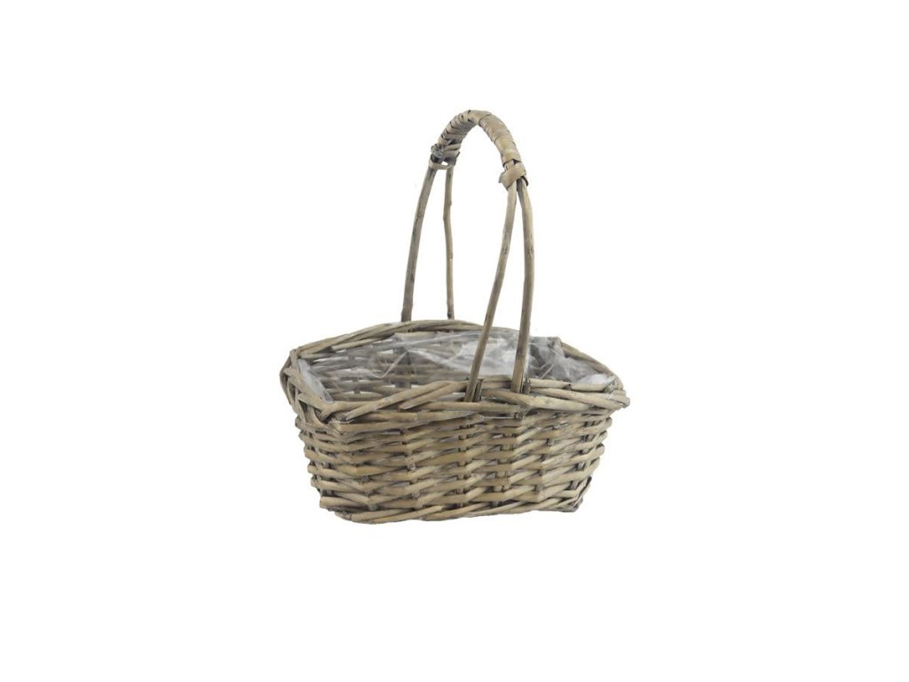 Dekorační košík s plastem. Rozměry: 24 x 16 x 26 / 9 cm. Materiál: proutí, plast. Barva: šedá. Tento výrobek je vyrobený ručně, tudíž nemusí být 100% vodotěsný.Doplňkové parametry