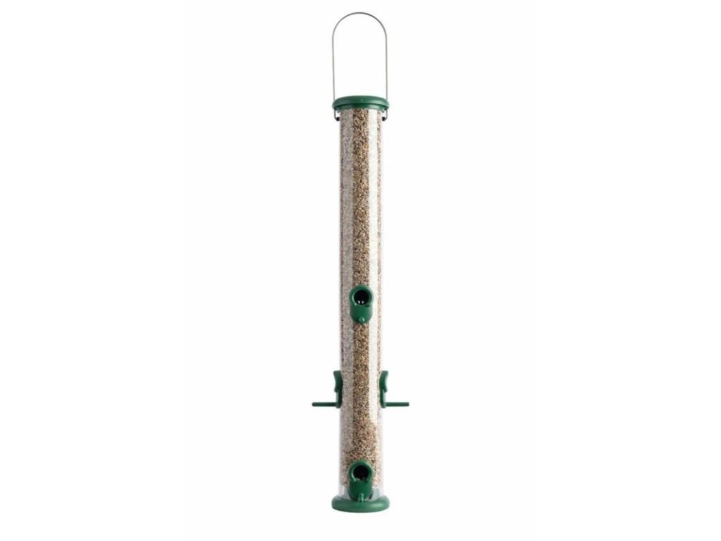 Krmítko je vyrobené z kvalitního UV odolného plastu (polykarbonát). Víčko se snadno odklopí (ale neztratí se, protože je spojené s krmítkem), takže se krmítko snadno doplňuje. Je vhodné například na slunečnicová semínka, která mají ptáci nejraději. S otvory a bidýlky. Otvory jsou konstruované tak, aby semínka byla snadno přístupná, ale nevypadávala ven. Konstrukce krmítka zamezuje chození ptáků v semínkách, což také eliminuje nakažení ptáků různými chorobami, například salmonelou, při kontaktu semínek s ptačím trusem.