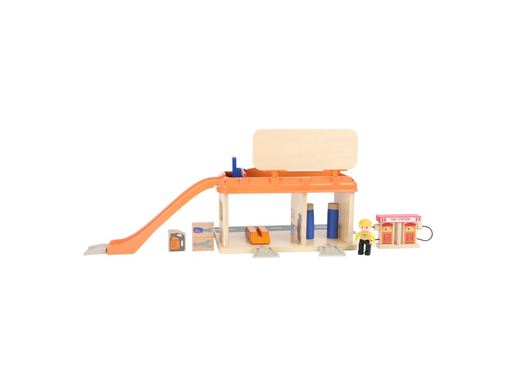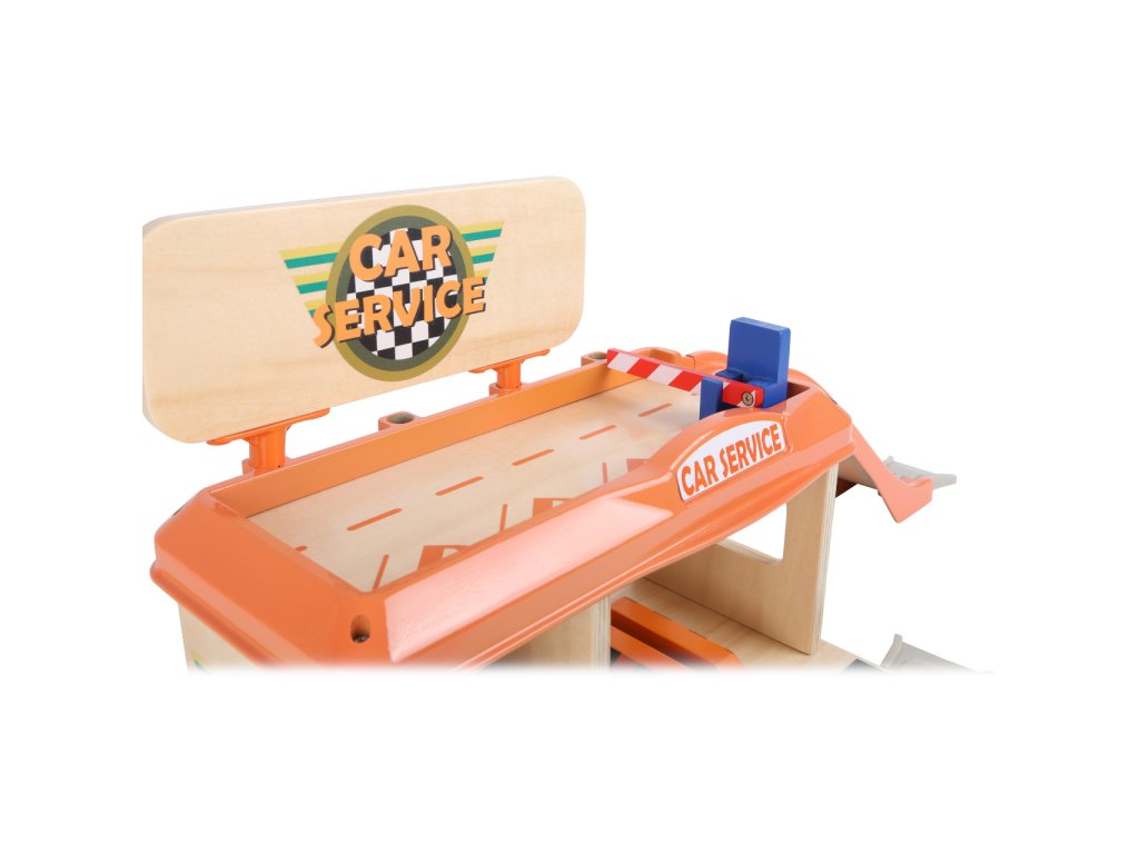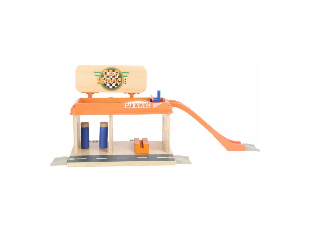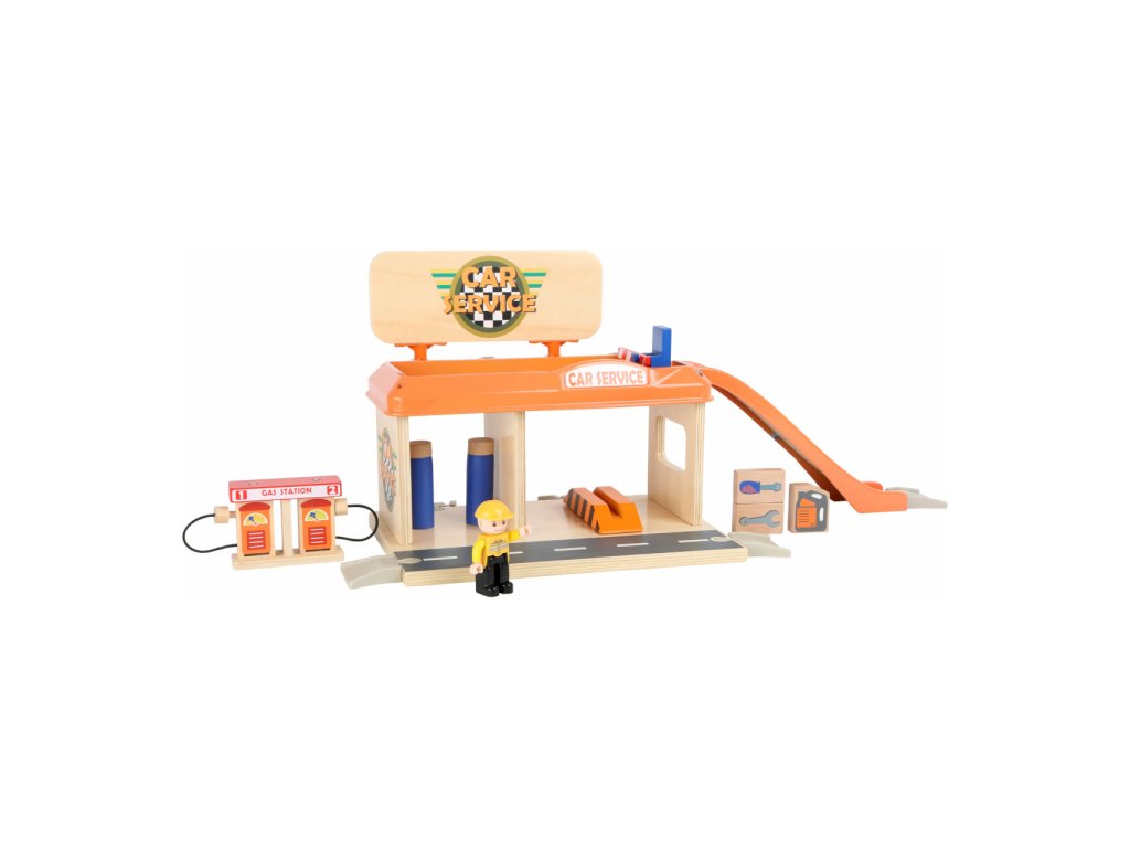 Služby na nejvyšší úrovni! Při pohledu na vybavení autoservisu zaplesá srdíčko každého malého fanouška motorů, jeho součástí je totiž krom autodílny vybavené plošinou a nezbytným příslušenstvím také čerpací stanice s magnetickými pistolemi, nebo myčka. Díky nájezdové rampě mohou zákazníci využít služeb parkoviště na střeše servisu, opatřeného bezpečnostní závorou. Co víc, k plné spokojenosti je zde k dispozici i pohyblivá figurka profesionální obsluhy a vždy připravené vozidlo taxislužby! Díky kombinaci silné překližky a robustních plastových dílů může hračka nabídnout vysokou odolnost a životnost. Lze ji rozšířit množstvím příslušenství a je také plně kompatibilní s vláčkodráhami jiných velkých výrobců. Hlavní vlastnosti:autoservis a čerpací stanice, 3 díly herních doplňků, autíčko a 1 figurka2 podlaží, rampa a parkoviště opatřené závorourobustní a odolné provedeníkompatibilní i s vláčkodráhami dalších výrobcůDoplňkové parametry