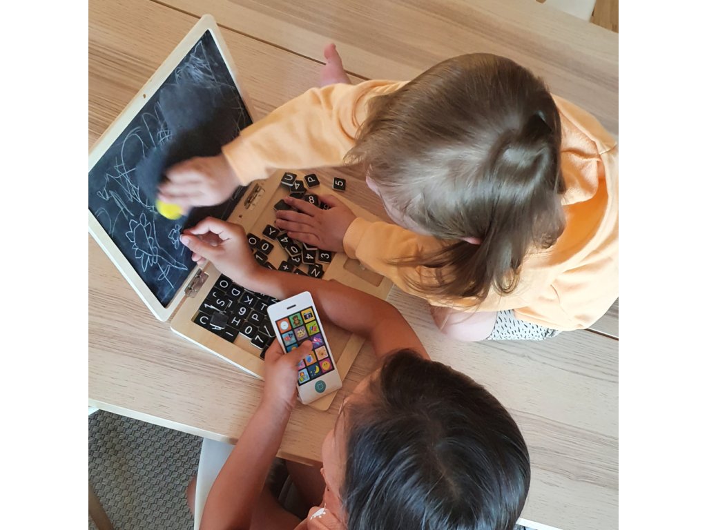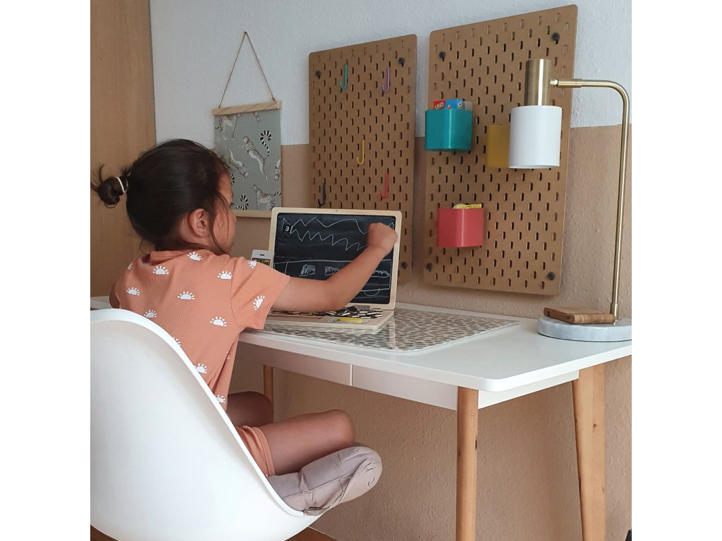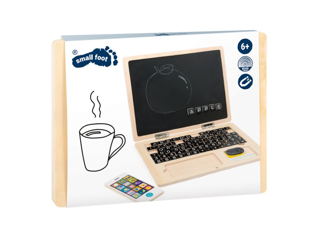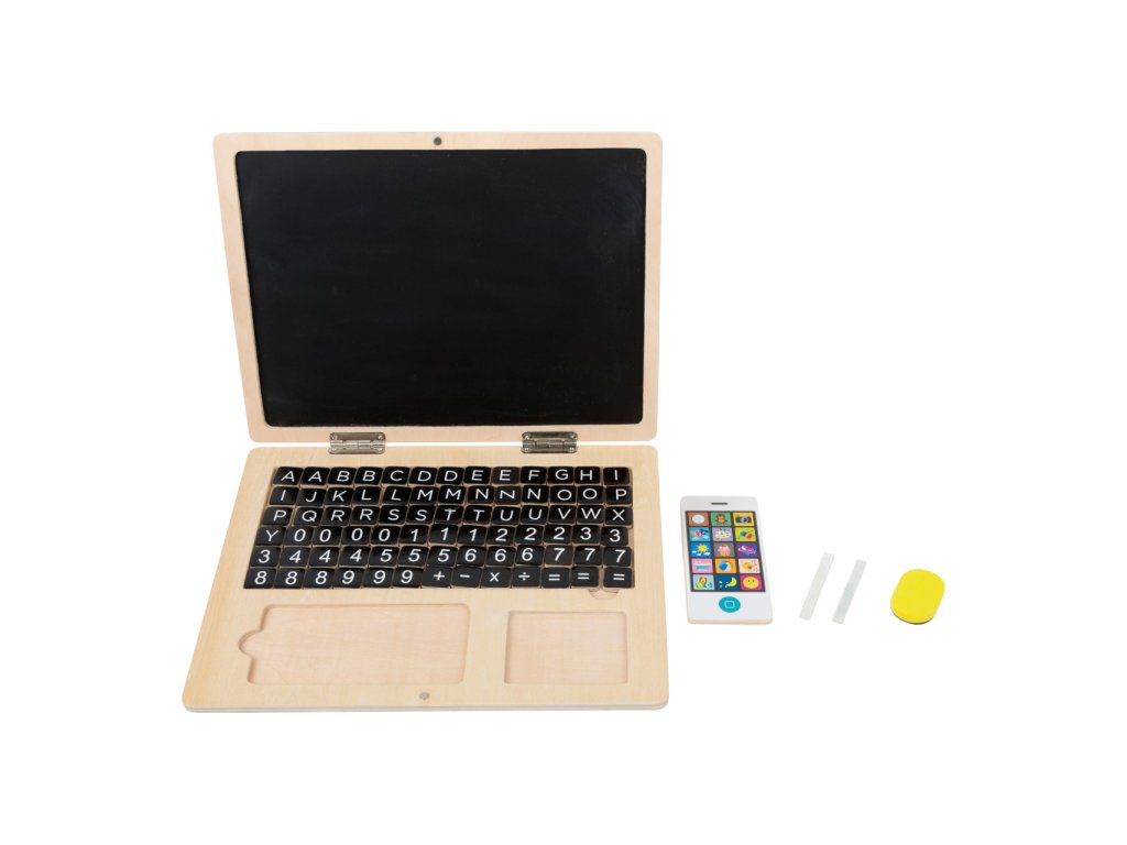 Pište na klávesnici stejně jako dospělí! S tímto dřevěným notebookem můžou mladí počítačoví nadšenci získat první zkušenosti s IT. Dílky s písmenky, čísly a znaky mohou děti jednoduše přesouvat a vytvářet tak slova nebo řešit matematické problémy a to na magnetické destičce – displeji notebooku. Křídou pak děti mohou kreslit obrázky nebo psát slova, které jednoduše smyjí houbičkou. V balení je také dřevěný smartfon. Notebook lze jednoduše přemísťovat a přepravovat díky jeho kompaktní velikosti. Balení obsahuje 83 dílů. Hlavní vlastnosti: kompakt velikost magnetické kreslící tabule v designu notebookuobahuje 78 magnetů, 1 houbu, 1 mobilní telefon, 2 křídy, 1 dřevěný notebookDoplňkové parametry