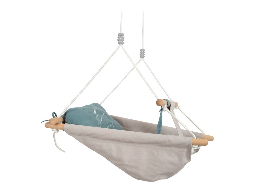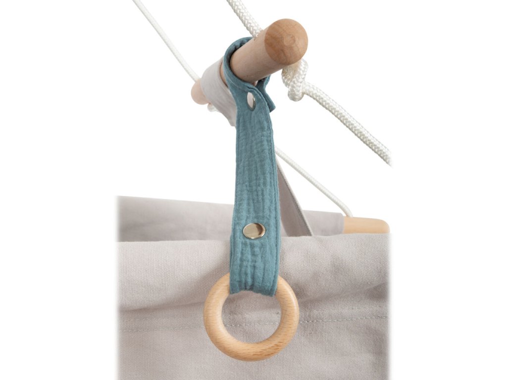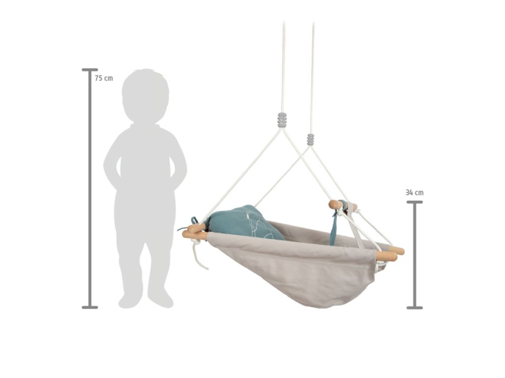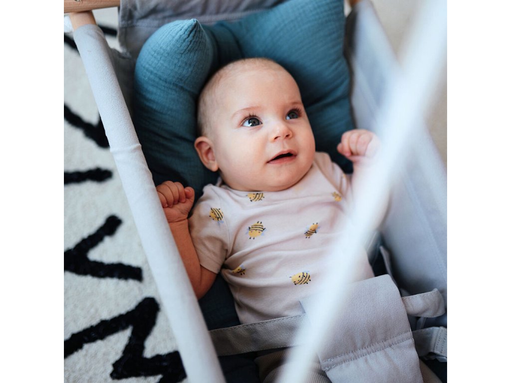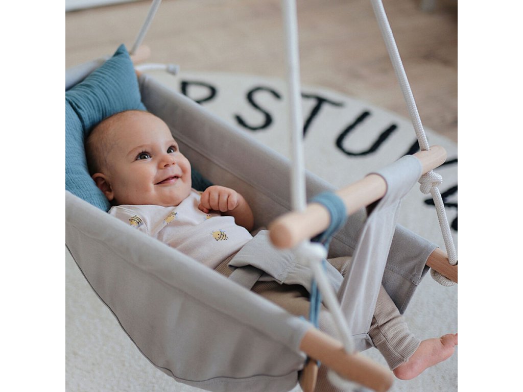 Textilní provedení houpačky nabízí mimořádný komfort díky promyšlenému designu, měkkému, odnímatelnému polštáři a 3bodovému pásu. Polštář je připevněn k houpačce pomocí poutek. Snadno udržovatelná textilie lehací plochy se optimálně přizpůsobí tvaru těla dítěte. V kouřově modré barvě, hravě doplní interiér nebo osvěží letní zahrádku. Pevná konstrukce z pečlivě opracovaného masivního dřeva, bezpečnostní popruhy a pás s rukojeťmi pomáhají zajistit vysokou bezpečnost při houpání nejmenších. Vysoký podíl masivního dřeva, přírodní materiály a trendy barva dělají z této dětské houpačky absolutní poutač. To pravé pro spokojená miminka. Hlavní vlastnosti: pohodlná dětská houpačkatkanina se přizpůsobí tělu dítětekvalitní, hladké dřevoměkký oddělitelný polštář lze zajistit poutkyv balení 3bodový pás, oddělitelný senzorický kroužekviditelné dřevo a další přírodní materiálylze připevnit i další doplňky, např. dudlíknosnost 30 kgDoplňkové parametry