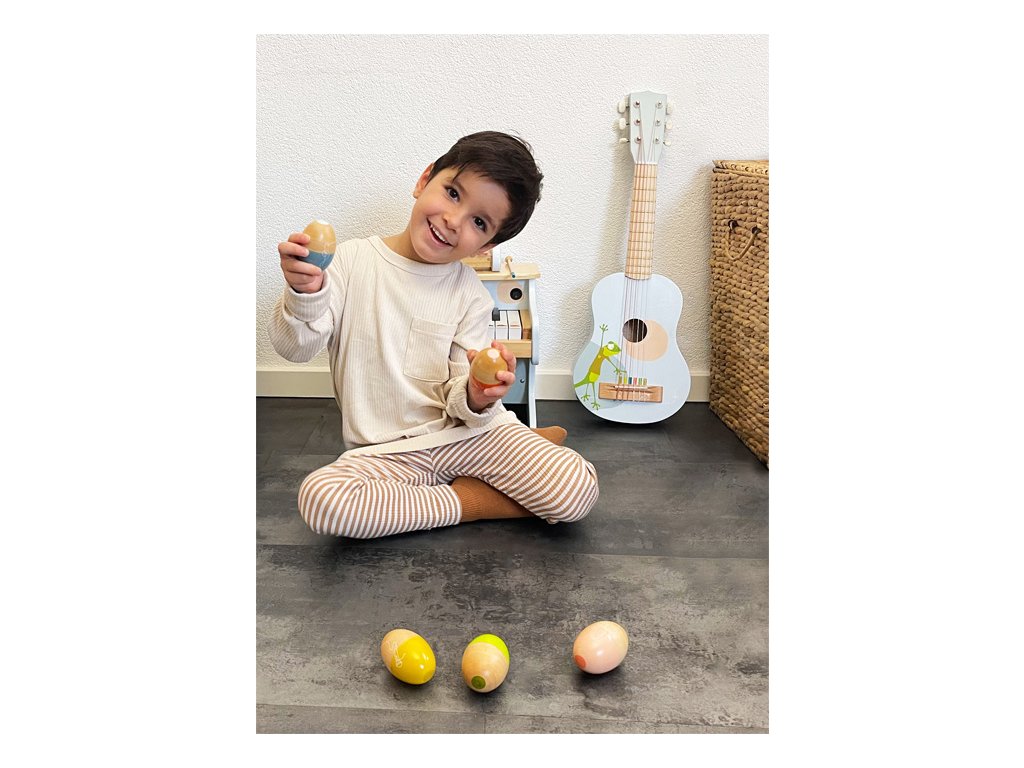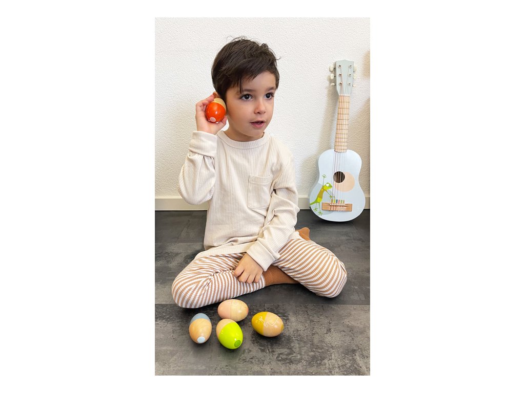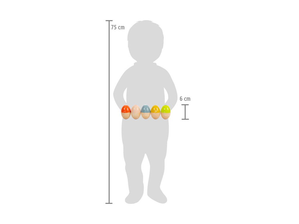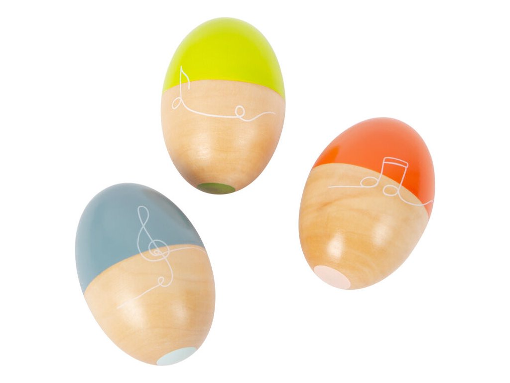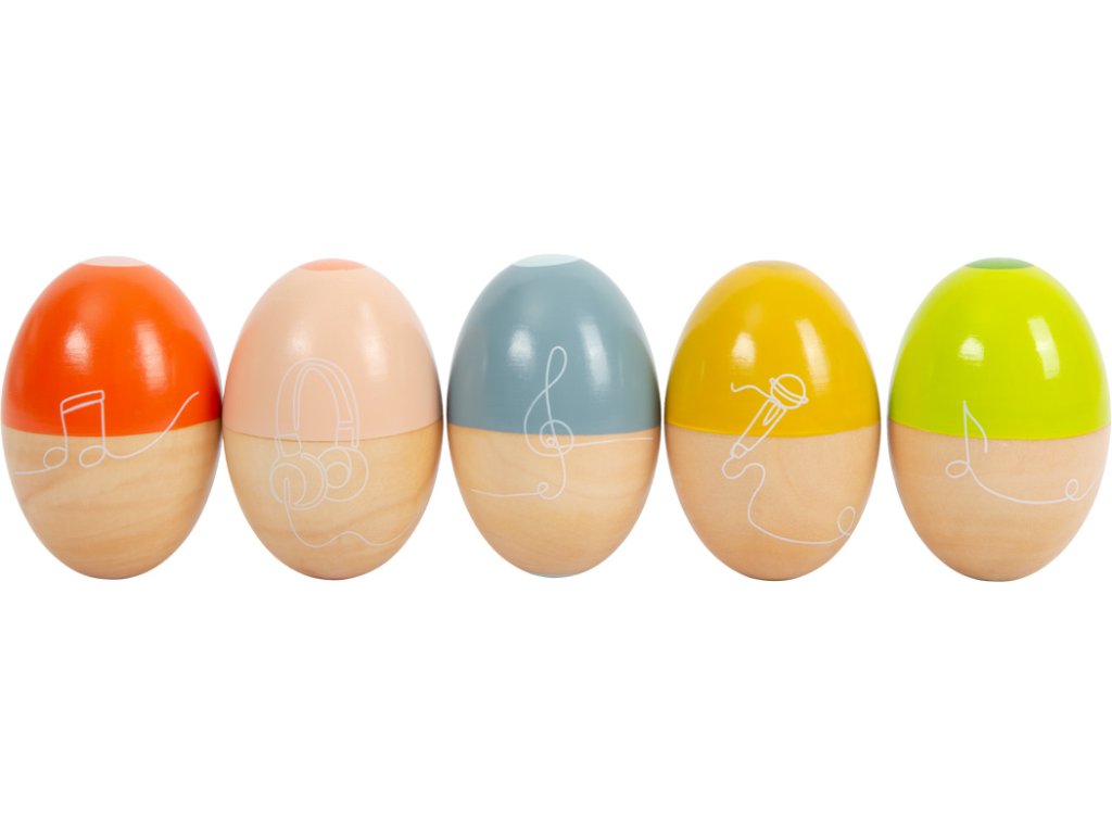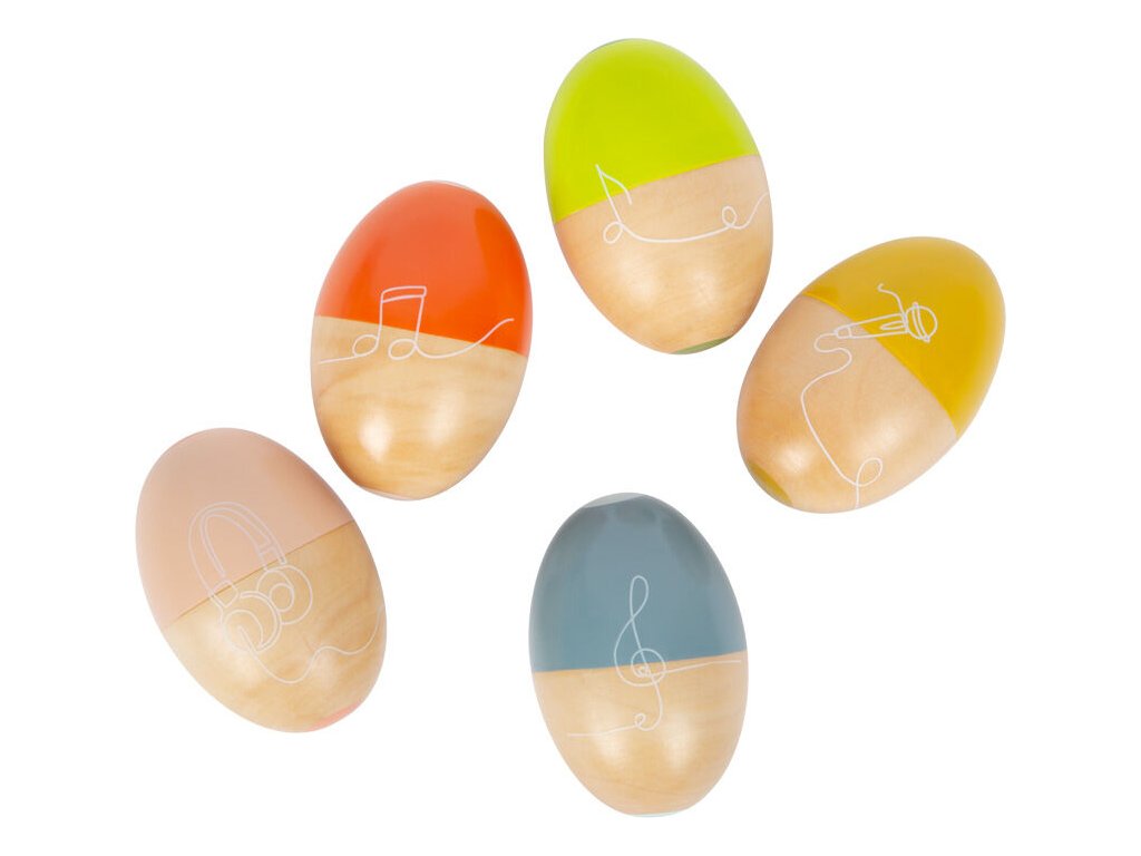 Třeste, chřestěte a válejte! Vytvořte tak báječné zvuky a něco příjemného pro vaše uši! Každé z pěti chrastících vajíček vyrobených z robustního masivního dřeva vydává jiný zvuk a nabízí všechny druhy rytmické zábavy. Vajíčka mají krásný tvar a dětská ručička je snadno uchopí. Díky kombinaci přírodního dřeva a moderních kontrastních barev jsou tato hudební vajíčka také vizuálními poutači! Absolutní hit pro milovníky zvuku! Hudební chrastící vajíčka trénují akustické vnímání i smysl pro rytmus a také rytmiku a koordinaci ruka-oko. Ideální pro ranou hudební výchovu! Hlavní vlastnosti: Rozvíjí jemnou motoriku a kreativituHravý úvod do světa zvuku a rytmuKaždé hudební vejce vydává jiný zvuk