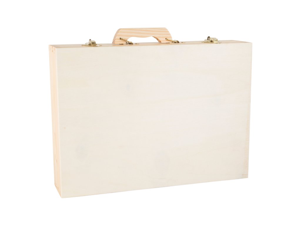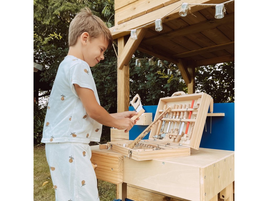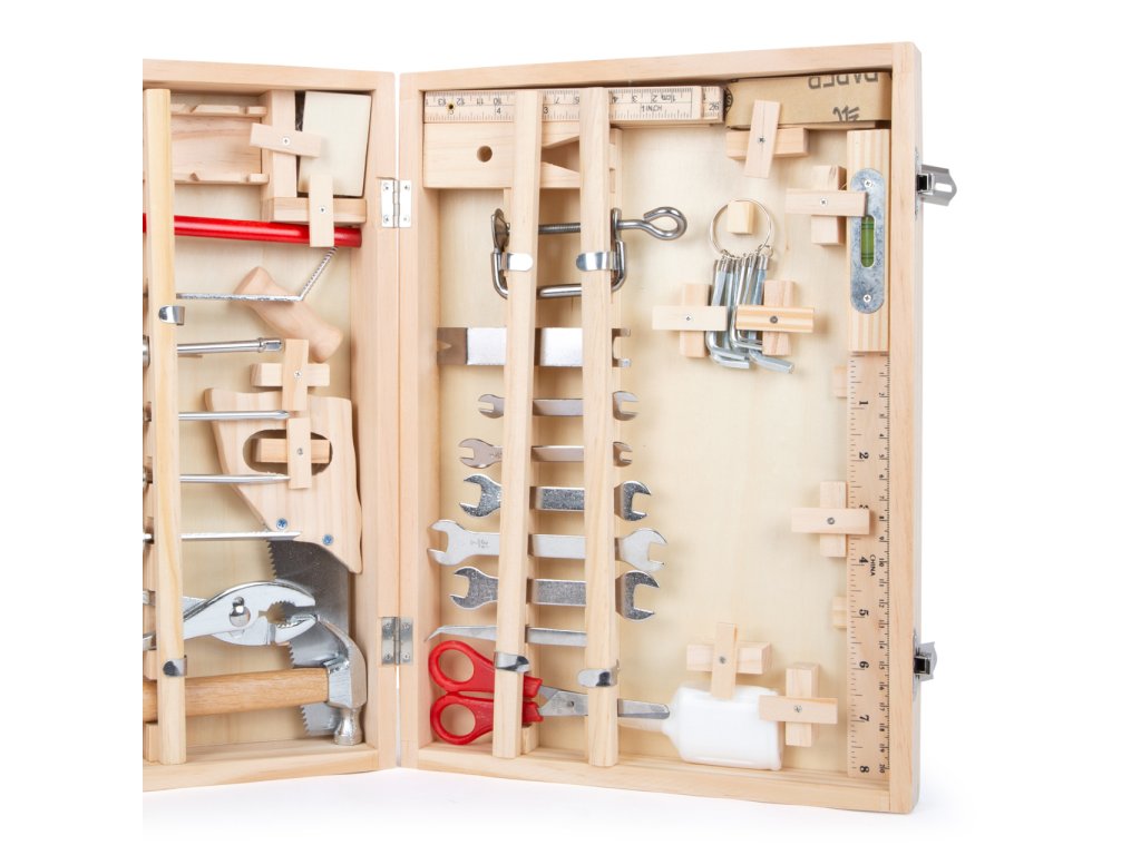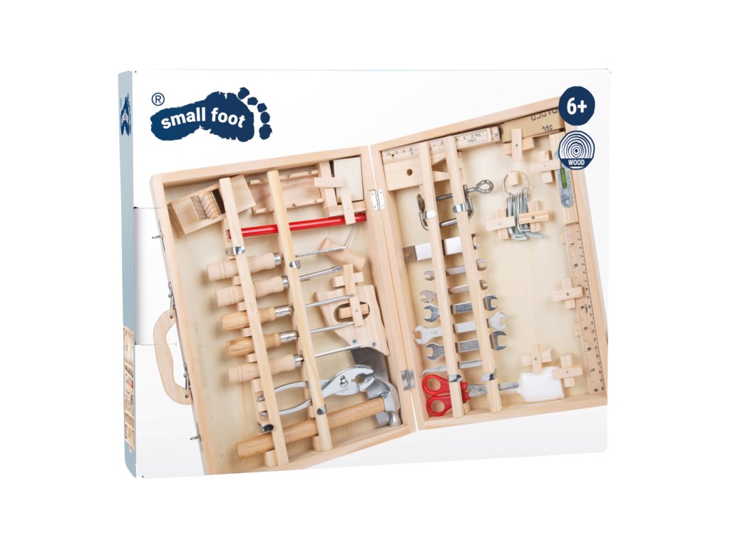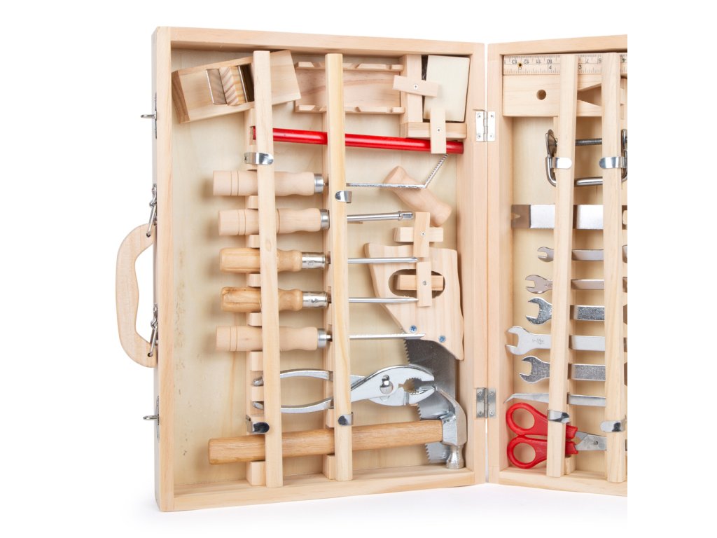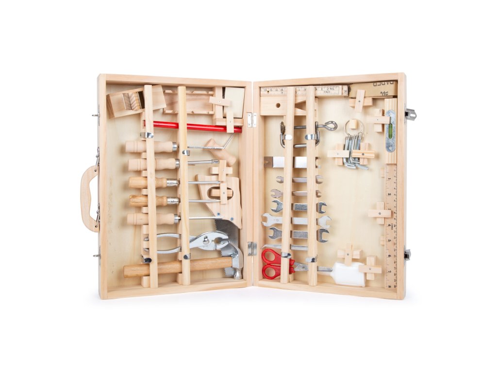 Kufřík Deluxe je komplexní sada nářadí: Závěsná dřevěná krabice s 48 díly pro malé domácí kutily! V kufříku Deluxe najdete všechno potřebné dřevěné i kovové nářadí pro všechny druhy prací a oprav. Najdete v něm klíče, šroubováky, pilu, nůžky, dláto, tesařskou tužku, šestihranný klíč, kladivo a další! Každá položka má své místo v kufru, všechny díly jsou vybaveny pojistkami, které je na svém místě drží. Hlavní vlastnosti: komplexní sada obsahuje 48 dílů praktický dřevěný kufr na uloženíDoplňkové parametry