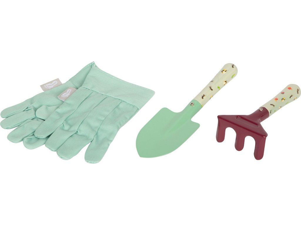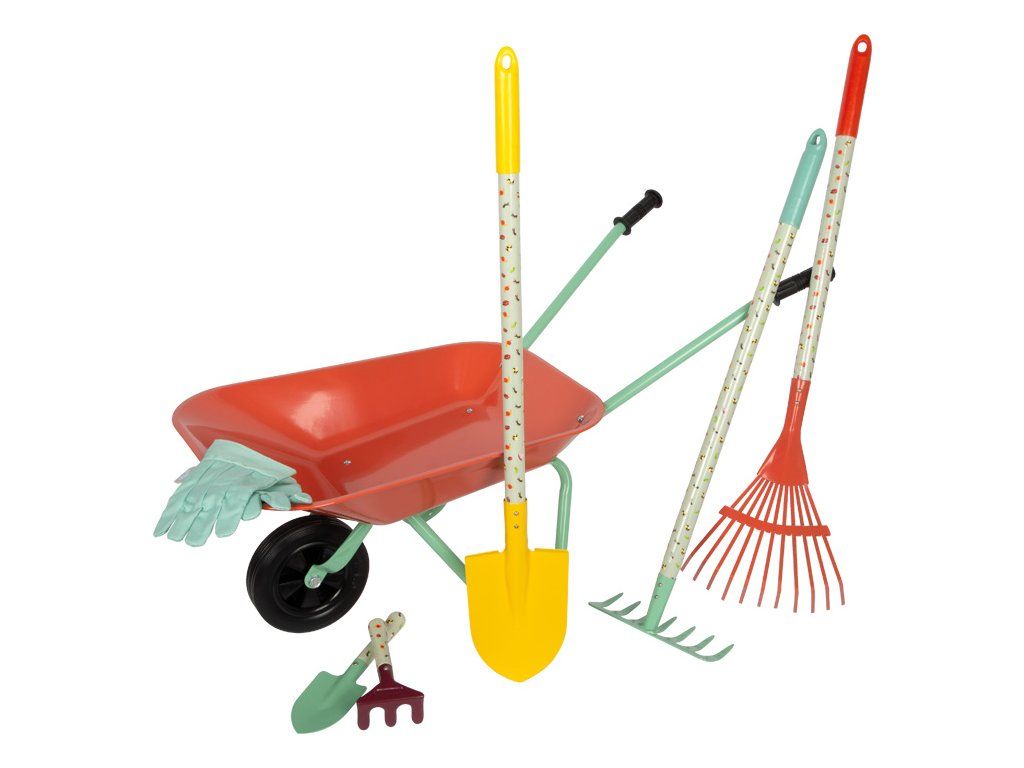 Obsahuje zahradní kolečko, tři velké nástroje (hrábě, rýč a motyku), dva menší ruční nástroje (lopatku a ruční hrábě) a odolné dětské zahradní rukavice.