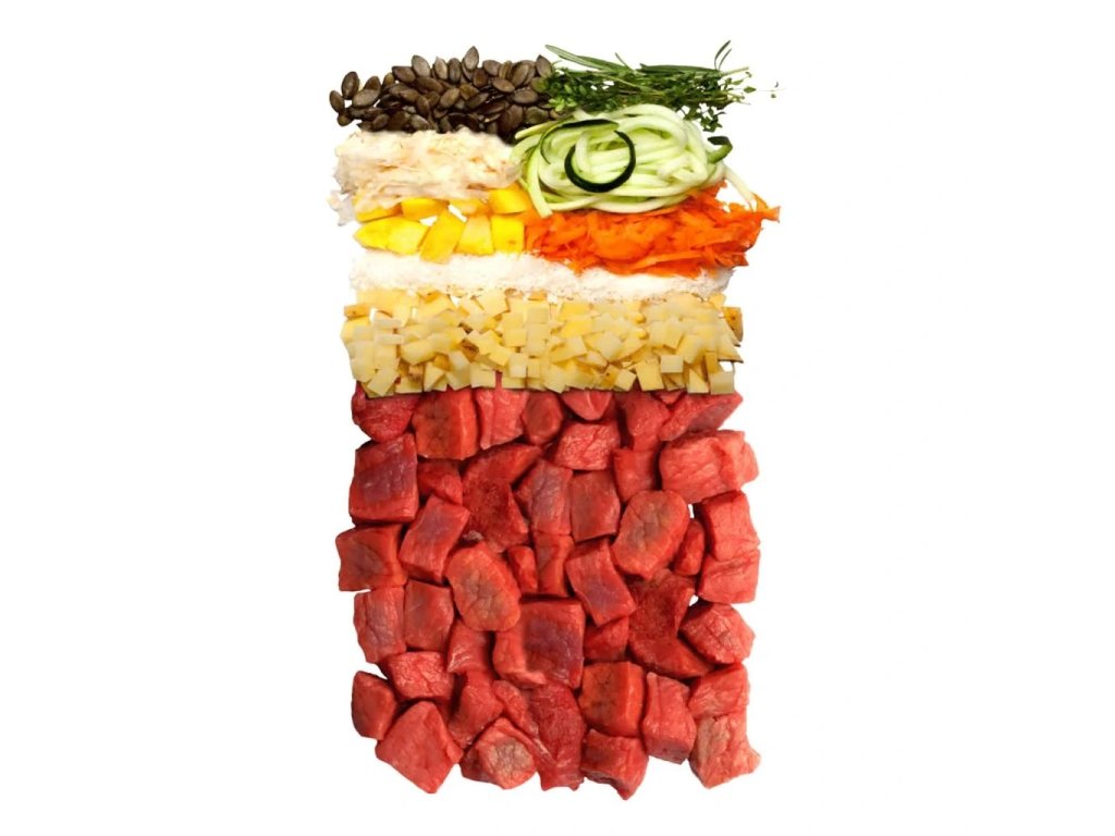 Čerstvá hovězí svalovina 64 %, bramborové vločky 15 %, lupina, jablko* 1,6 %, kokosová mouka 1,5 %, mrkev* 1,4 %, cuketa* 1,4 %, celer* 1,1 %, čerstvá hovězí játra 1 %, lněné semínko 1 %, mouka z dýňových semínek 1 %, dýně* 0,8 %, pastinák* 0,8 %, prášek z vaječných skořápek 0,6 %, pivovarské kvasnice * 0,5 %, broskev* 0,5 %, petrželová nať* 0,4 %, řepkový šrot 0,4 %, pískavice řecké seno 0,4 %, šalvěj 0,4 %, minerální jíl 0,3 %, špenát* 0,2 %, mořské řasy 0,1 %, šípek* 0,1 %, rozmarýn 0,1 %, tymián 0,1 %, květ černého bezu* 0,1 %, pampeliška*, aloe vera 0,1 %, minerální látky.