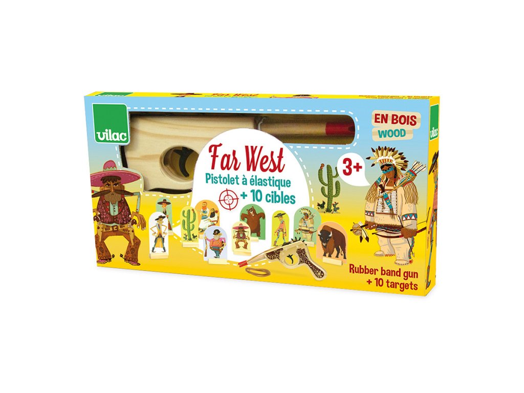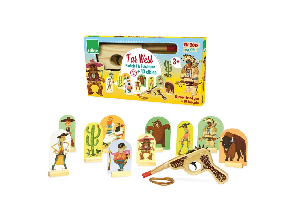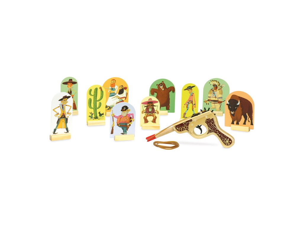 Divoký západ! Westernová hra, ve které vyhrává ten, kdo sestřelí nejvíce cílů. Jednoduše natáhněte gumičku na dřevěnou pistolku, postavte terče a můžete začít střílet. Hlavní vlastnosti: trénuje přesnostDoplňkové parametry