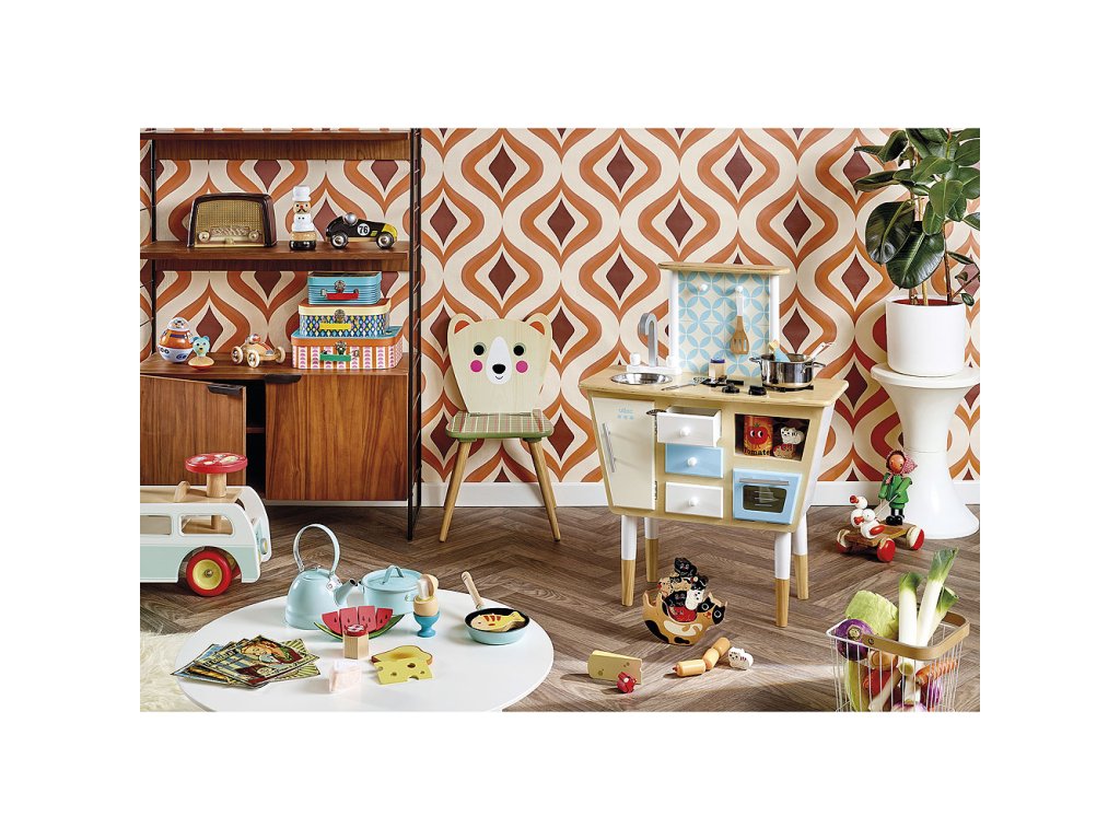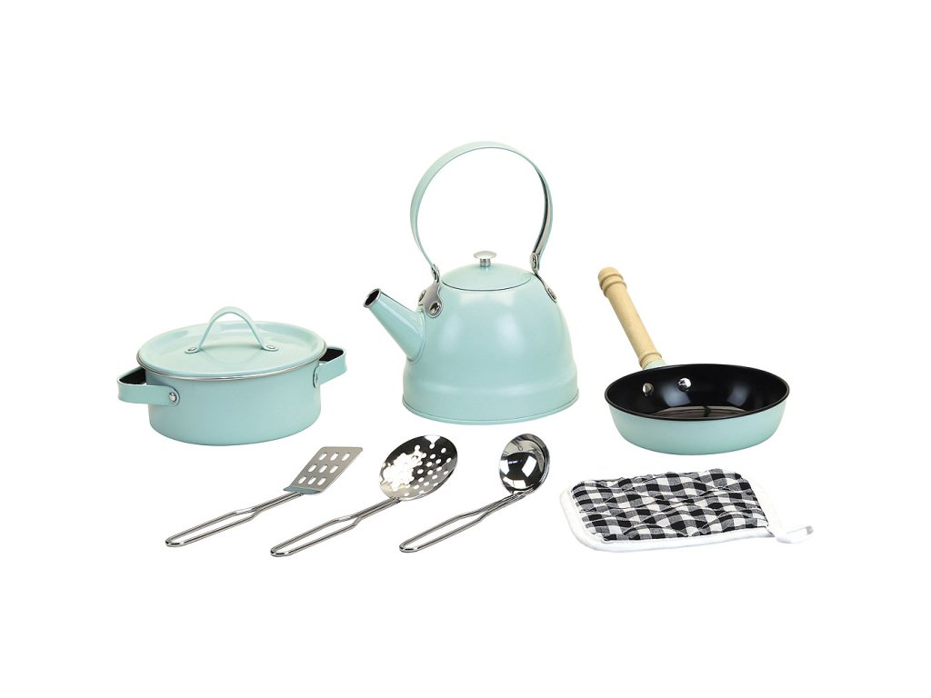 Vintage kuchyňská sada z malovaného kovu, ideální doplněk dětských kuchyní. Obsahuje pánev, hrnec, varnou konvici, 2 typy naběračky a obracečku a podložku pod hrnec. Hlavní vlastnosti: vhodná do každé kuchyňkyDoplňkové parametry