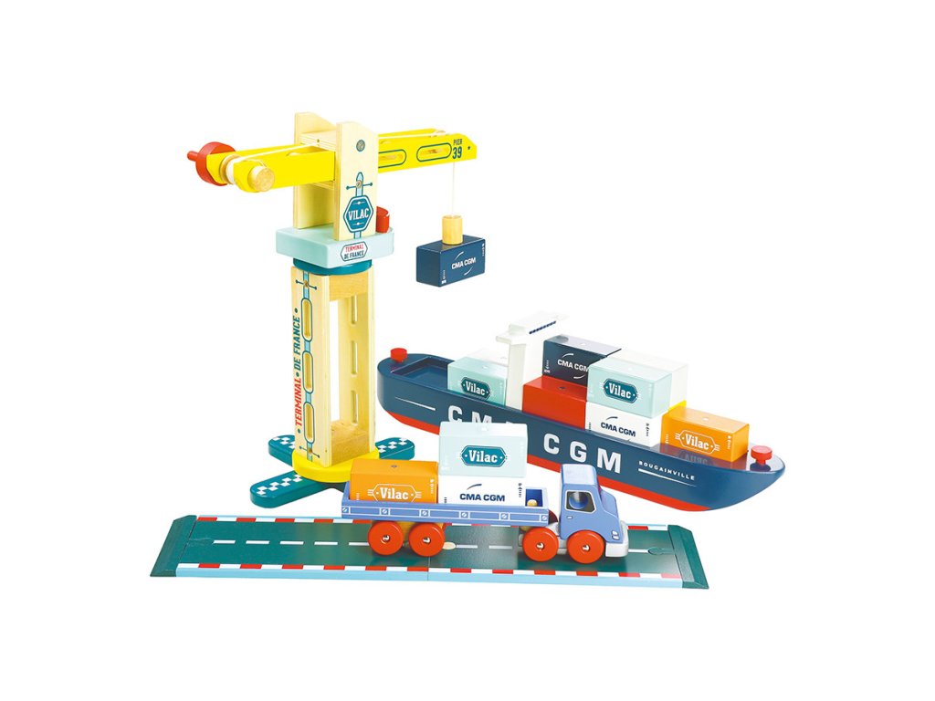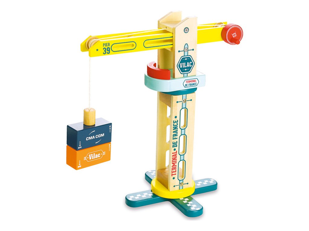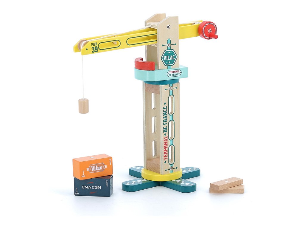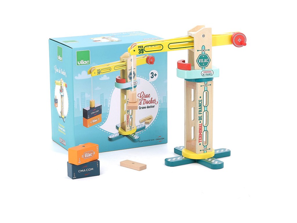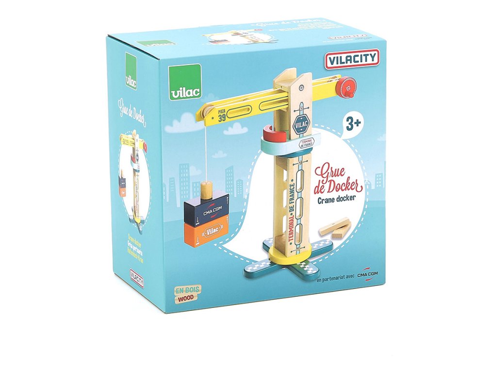 Dřevěný přístavní jeřáb s magnetickým úchopem pro jednoduché přesouvání kontejnerů. Jeho konstrukce umožňuje manipulaci s břemenem ve všech příhodných směrech. Je součástí Vilacity kolekce a je se všemi jejími součástmi plně kompatibilní, další samostatná rozšíření přinesou variabilitu a prohloubí zážitek ze hry. Hlavní vlastnosti:otočný, břemeno lze zdvihat i horizontálně posouvatmagnetický úchopkompatibilní se všemi součástmi Vilac Vilacity kolekcevyrobeno ekologicky, šetrně k prostředí V2356 – Nákladní loď Vilacity (není součástí sady, najdete v naší nabídce): V2356S – Nákladní loď Jacques Saadé Vilacity (není součástí sady, najdete v naší nabídce): V2358 – Nákladní auto Vilacity (není součástí sady, najdete v naší nabídce): Příklad sestavy jeřábu s dalšími součástmi kolekce Vilacity:Doplňkové parametry