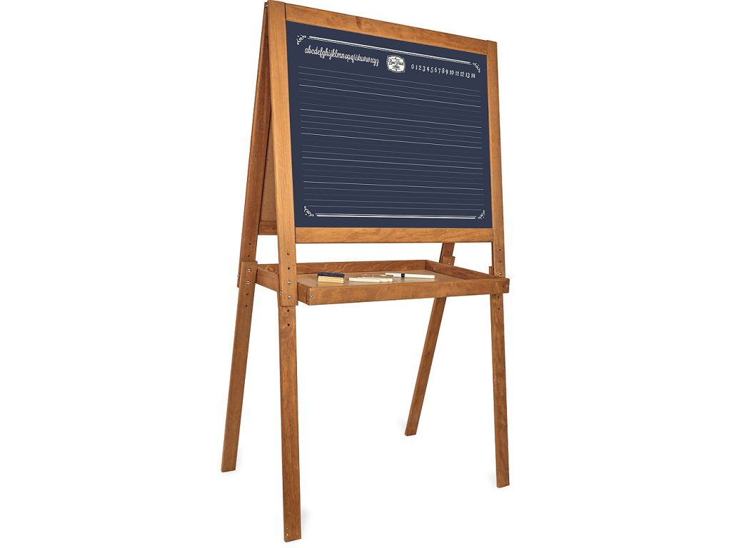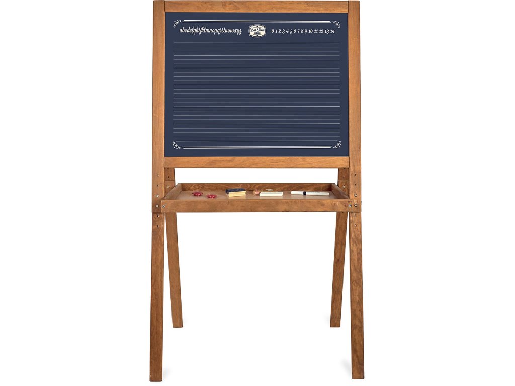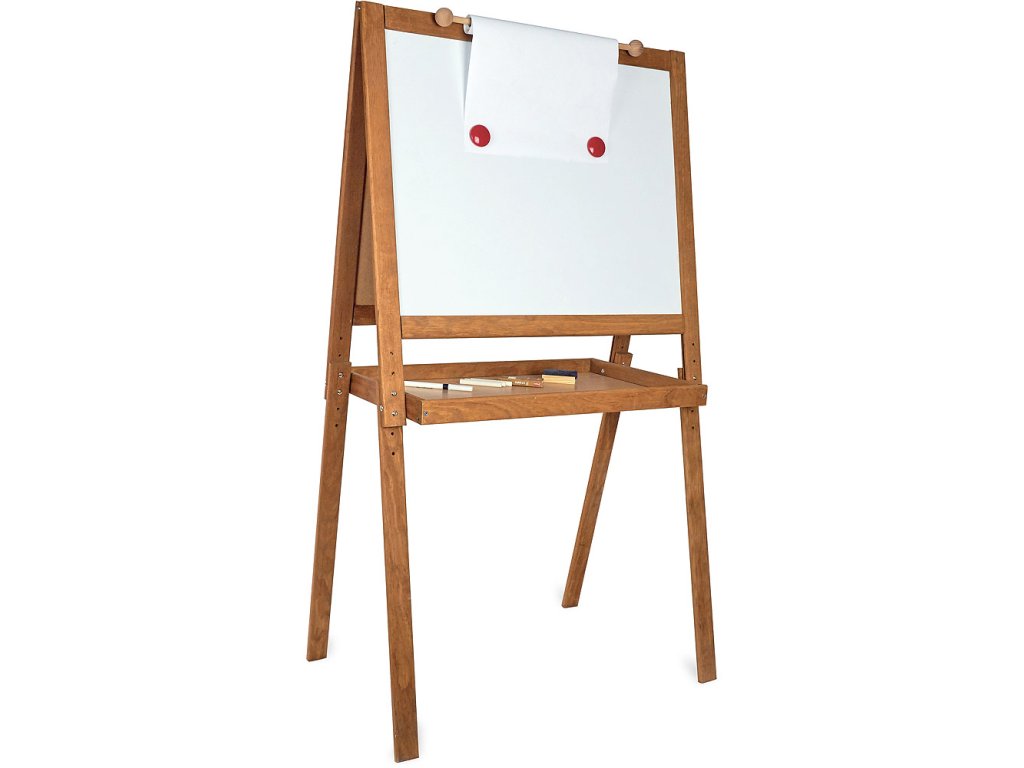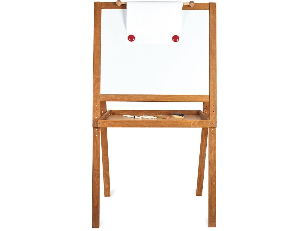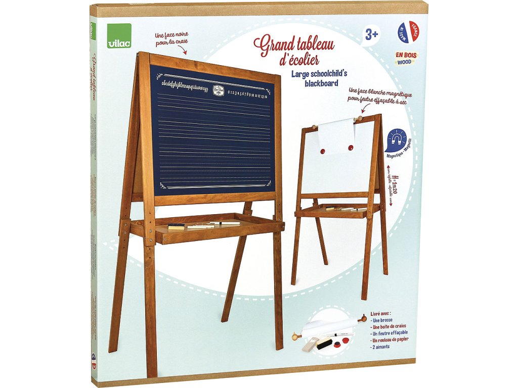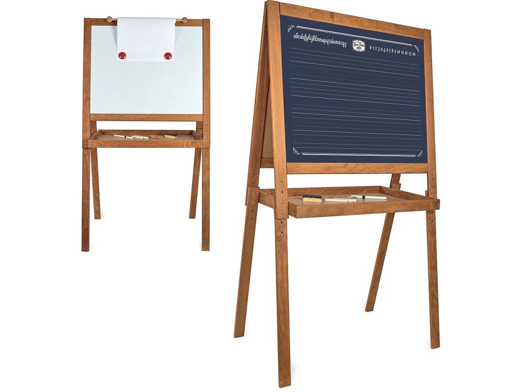 Velká dřevěná tabule, má jednu stranu černou na psaní křídou a druhou bílou na fixy a magnetky. Pod tabulí je také deska pro uložení fixů, křídy... Tabule má nastavitelnou výšku, maximálně však 120 cm. Vyrobeno ve Francii. Hlavní vlastnosti: magnetická tabule na fixy i křídyvyrobeno ve Franciivýška 120 cmDoplňkové parametry