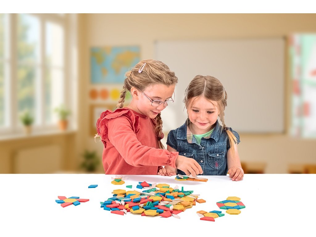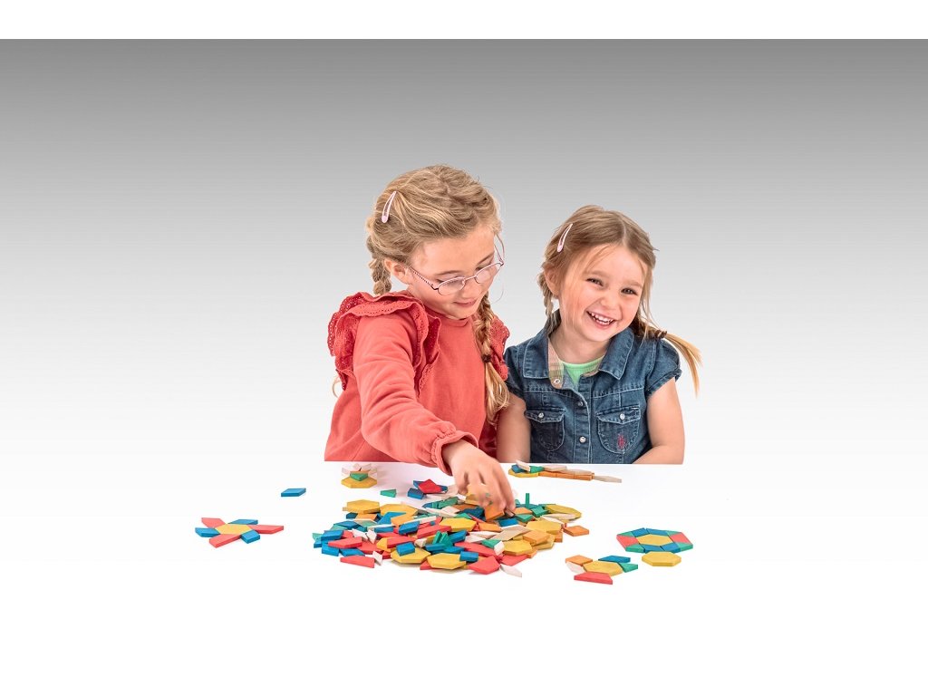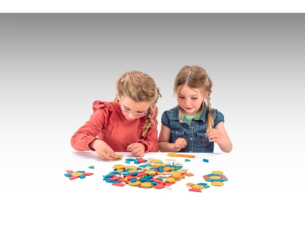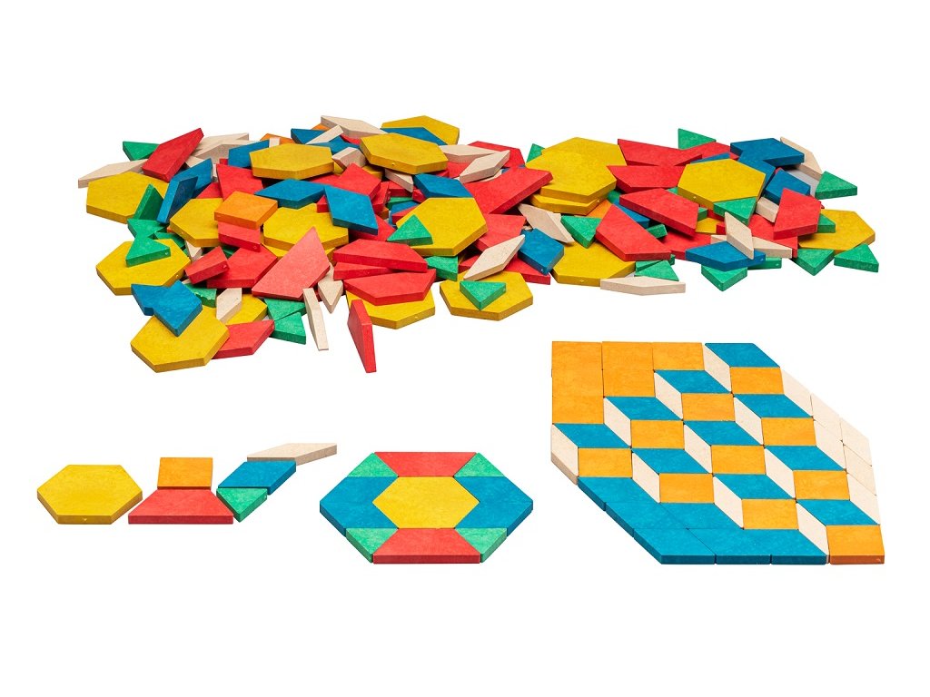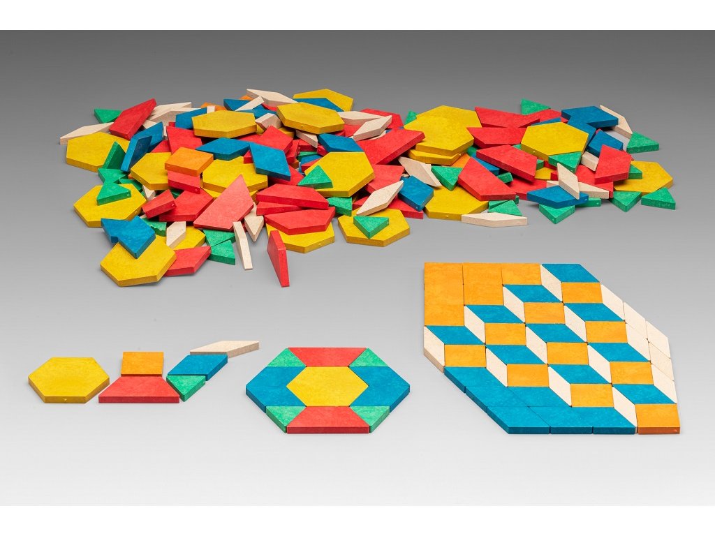 250 ks barevných dílků v 6 geometrických tvarech, které slouží ke hraní i učení se o tvarech a barvách. Zapojte svou kreativitu a složte si 3D obrázky. Ozdoby, zvířata, čísla, ornamenty či mandaly. Dítě si osvojuje objevování symetrie a pojmenovávání různých tvarů a povrchů. Balení obsahuje 25 žlutých šestiúhelníků, 25 oranžových čtverců, 50 červených lichoběžníků, 50 zelených trojúhelníků, 50 modrých rovnoběžníků a 50 béžových kosočtverců. Vyrobeno ze 100 % recyklovaných materiálů, má certifikaci PEFC a po použití jej lze opakovaně recyklovat. Hlavní vlastnosti: obsahuje 250 dílůprvní hravé zkušenosti s geometriíobsahuje návod a 20 různých možností skládánívyrobeno v NěmeckuDoplňkové parametry